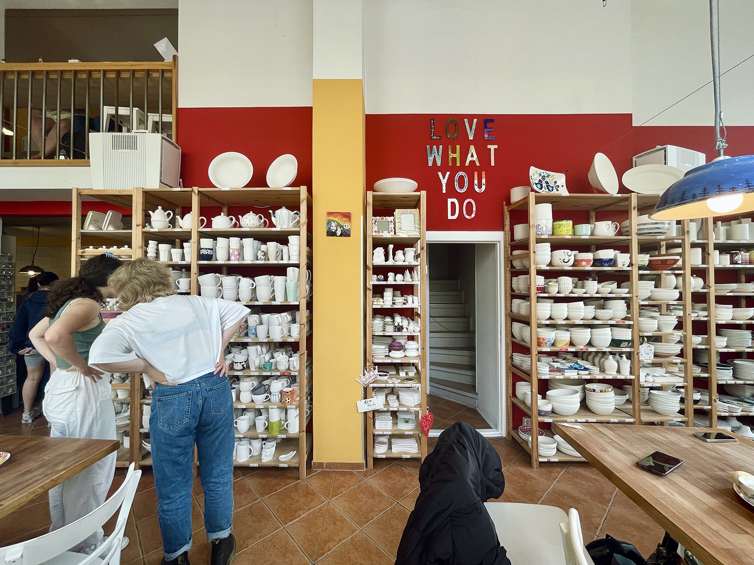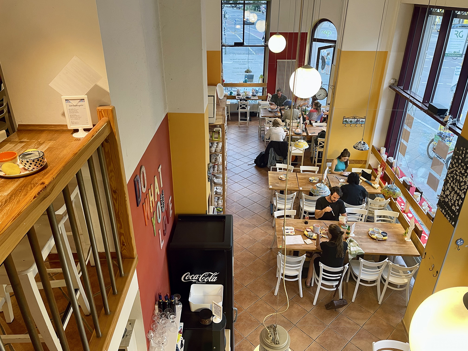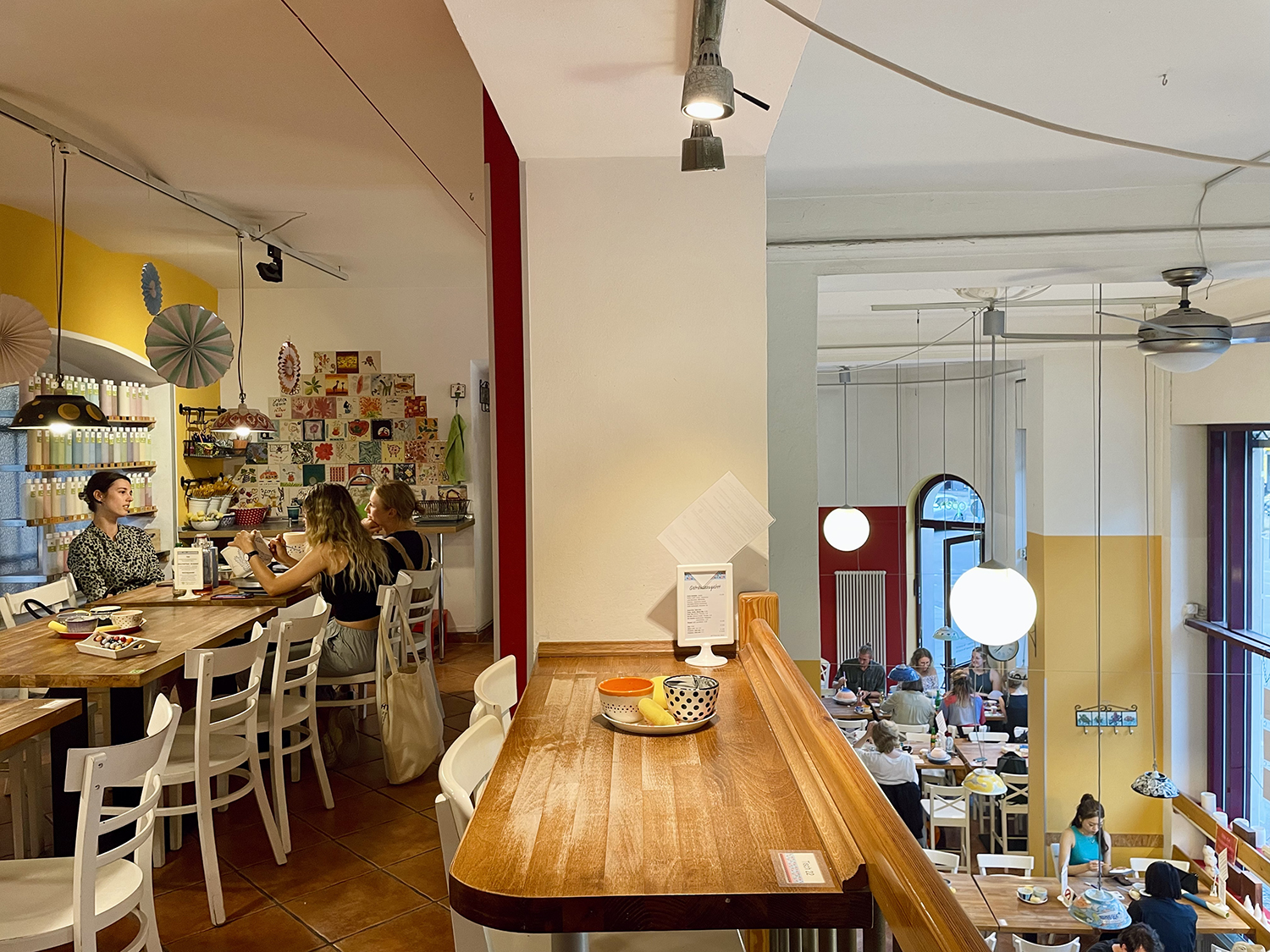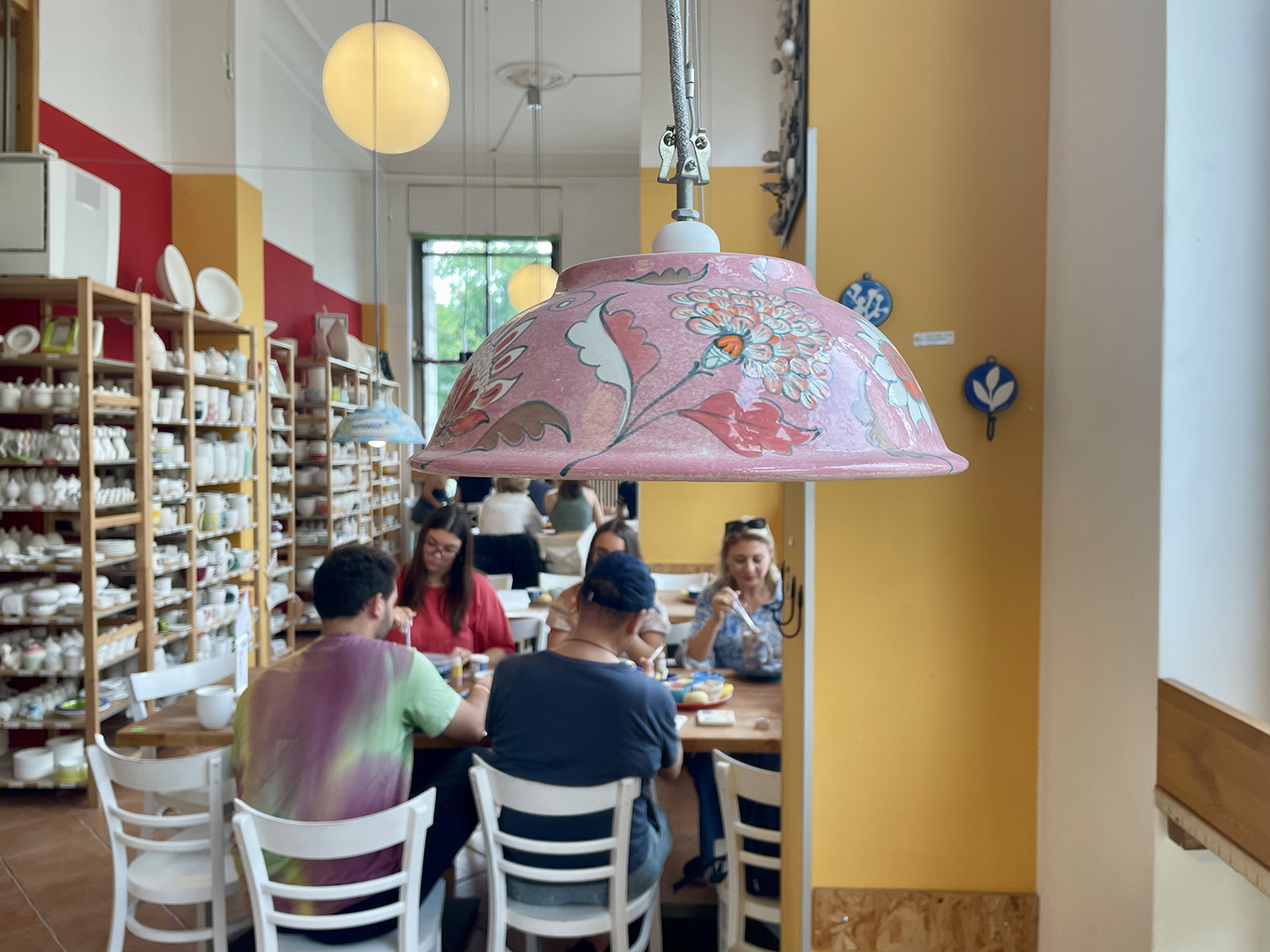 L’atmosfera è calma e vivace allo stesso tempo. Ai tavoli ci sono persone in solitaria oppure gruppi di amiche, coppie, famiglie, giovani padri con prole. Tutti concentrati nella propria creazione. Chi in silenzio e chi chiacchierando a bassa voce per non disturbare i vicini.