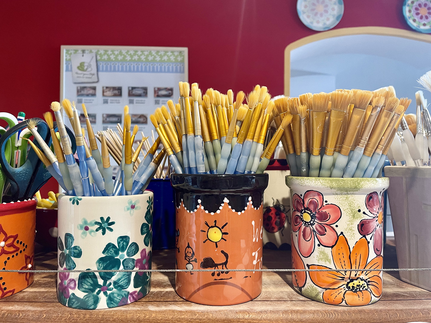 - Pittura: scegli poi i colori, pennelli, stencil e qualsiasi altro strumento che ti va di usare per dipingere il tuo pezzo; se è la tua prima volta, leggi le semplici istruzioni che trovi sul tavolo e per qualsiasi dubbio fatti consigliare dallo staff.