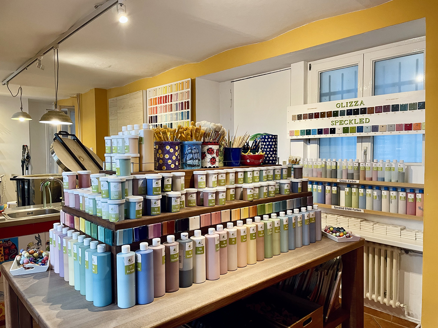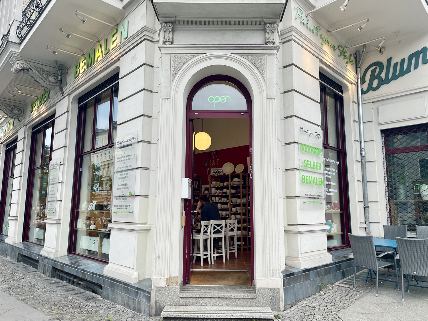 Noi siamo state in uno dei 7 store presenti nella capitale tedesca: a quanto dicono a Berlino, quello con lo spazio più bello poiché si sviluppa su due piani e ha grandi vetrate che si affacciano su Bergmannstasse, una delle vie principali del quartiere Kreuzberg (qui l’indirizzo: Paint your Style, Mehringdamm 73 – Berlin).