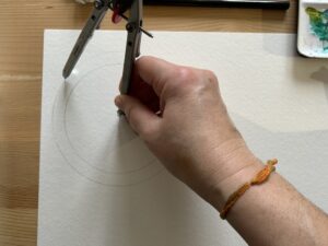 Prendi un cartoncino per acquerello 24x33cm. Con il compasso, su una metà del foglio, disegna un cerchio leggero più grande ed uno più piccolo all’interno, in modo da formare una cornice circolare. puoi usare anche la matita e tracciare i cerchi a mano libera in modo leggero. Sulla linea del cerchio aggiungeremo piccoli elementi primaverili: fiori, foglie, rametti. Non serve precisione assoluta: questo è il momento dell’idea, non della perfezione.