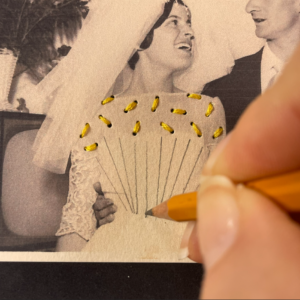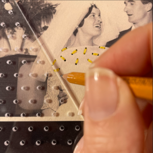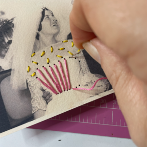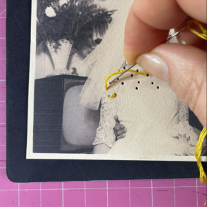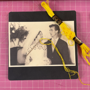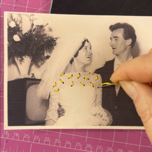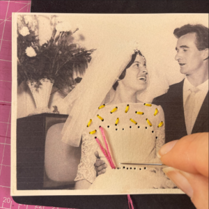 1. Con l’aiuto di un punteruolo forare la foto sullo scollo della sposa in modo da creare delle coppie di fori mantenendoli ad una distanza costante. Durante questa operazione posizionare il tappetino sotto la foto per evitare di rovinare la superficie su cui si lavora. Infilare l’ago utilizzando quattro capi del filo da ricamo di colore giallo.