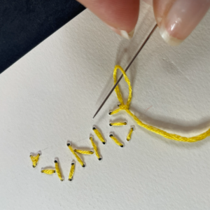 7. Terminare il ricamo del corpetto utilizzando il PUNTO SCRITTO. Si esegue procedendo in avanti con l’ago, ma inserendo l’ago all’indietro, alla fine del punto precedente. Per comprendere meglio questo punto puoi trovare il video QUI!  Proseguire creando sette fori sopra il bouquet.