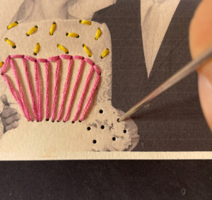 6. Infilare l’ago con il filo rosa utilizzando solo quattro capi. Creare un nodo in una estremità e puntare l’ago dal retro e uscire dal dritto della foto ed eseguire i passaggi qui sotto.