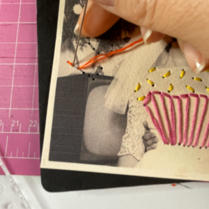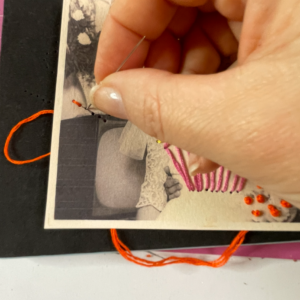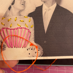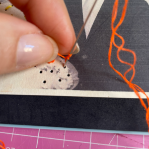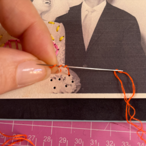 8. Infilare l’ago con il filo arancio utilizzando solo due capi. Creare un nodo ad una estremità e uscire in superficie puntando dal rovescio della foto. Creare il punto vapore rigirando il filo per tre o quattro volte intorno alla punta dell’ago. Poi puntare l’ago e farlo uscire sul rovescio della foto.