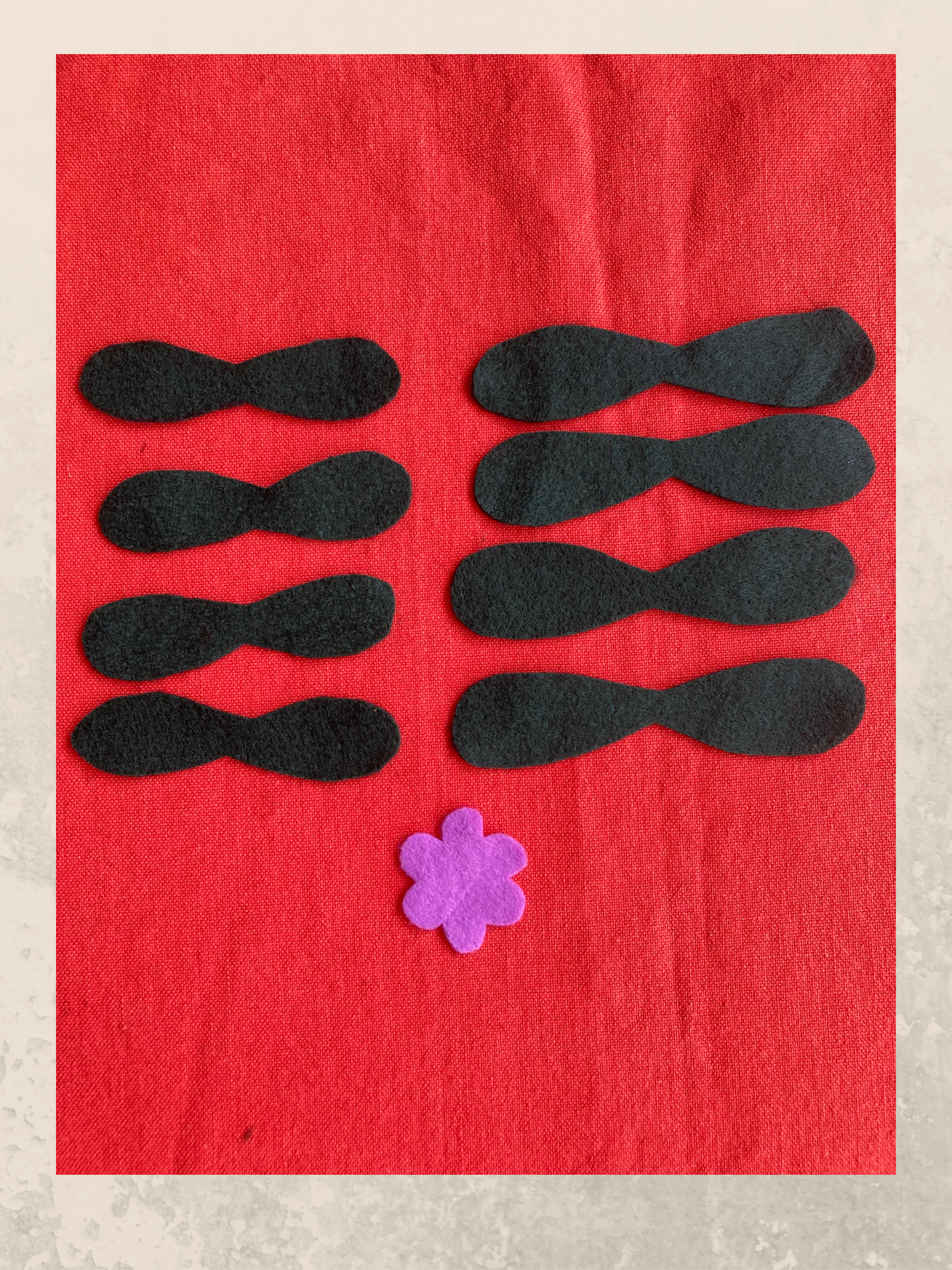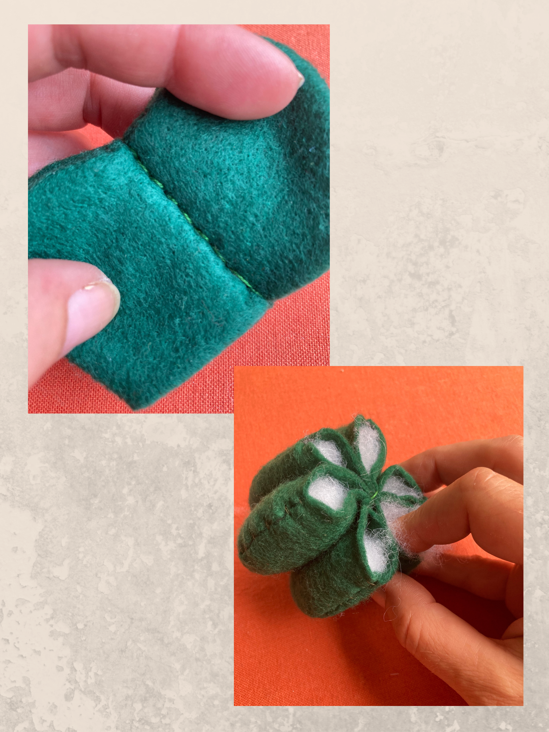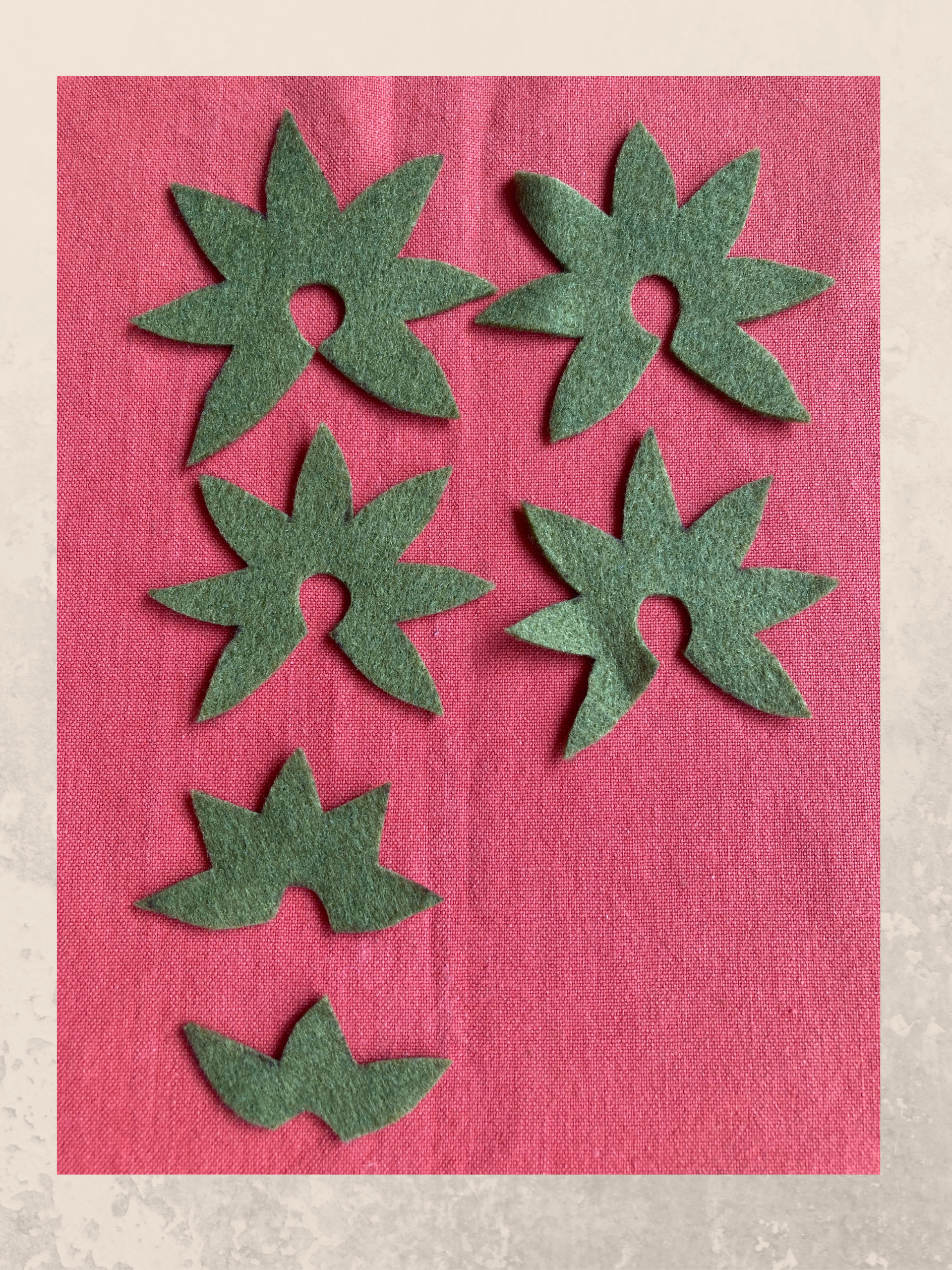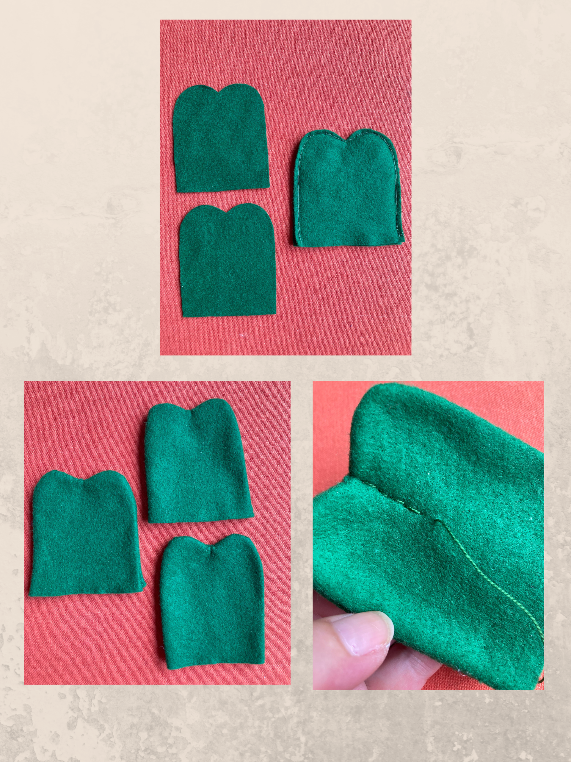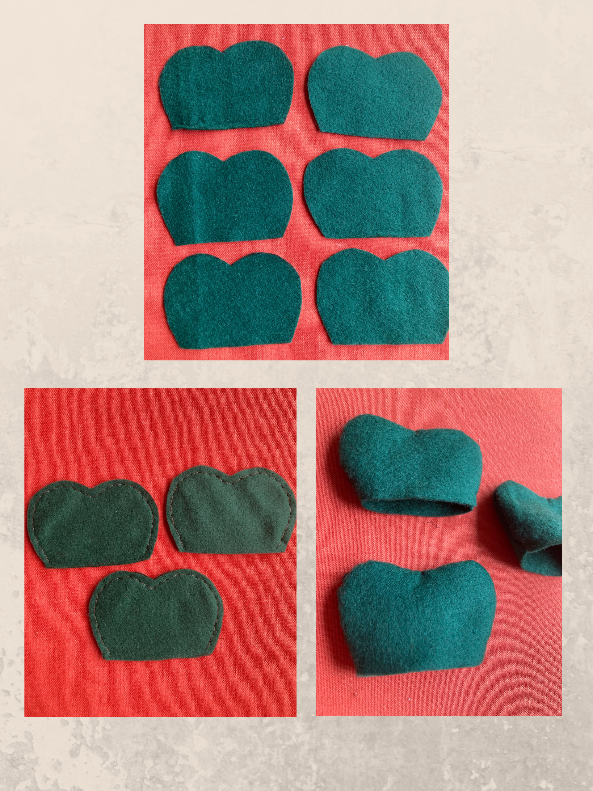 - Riporta sul pannolenci verde scuro sei volte la stessa sagoma. Ritaglia con cura e cuci insieme due sagome alla volta a punto indietro.