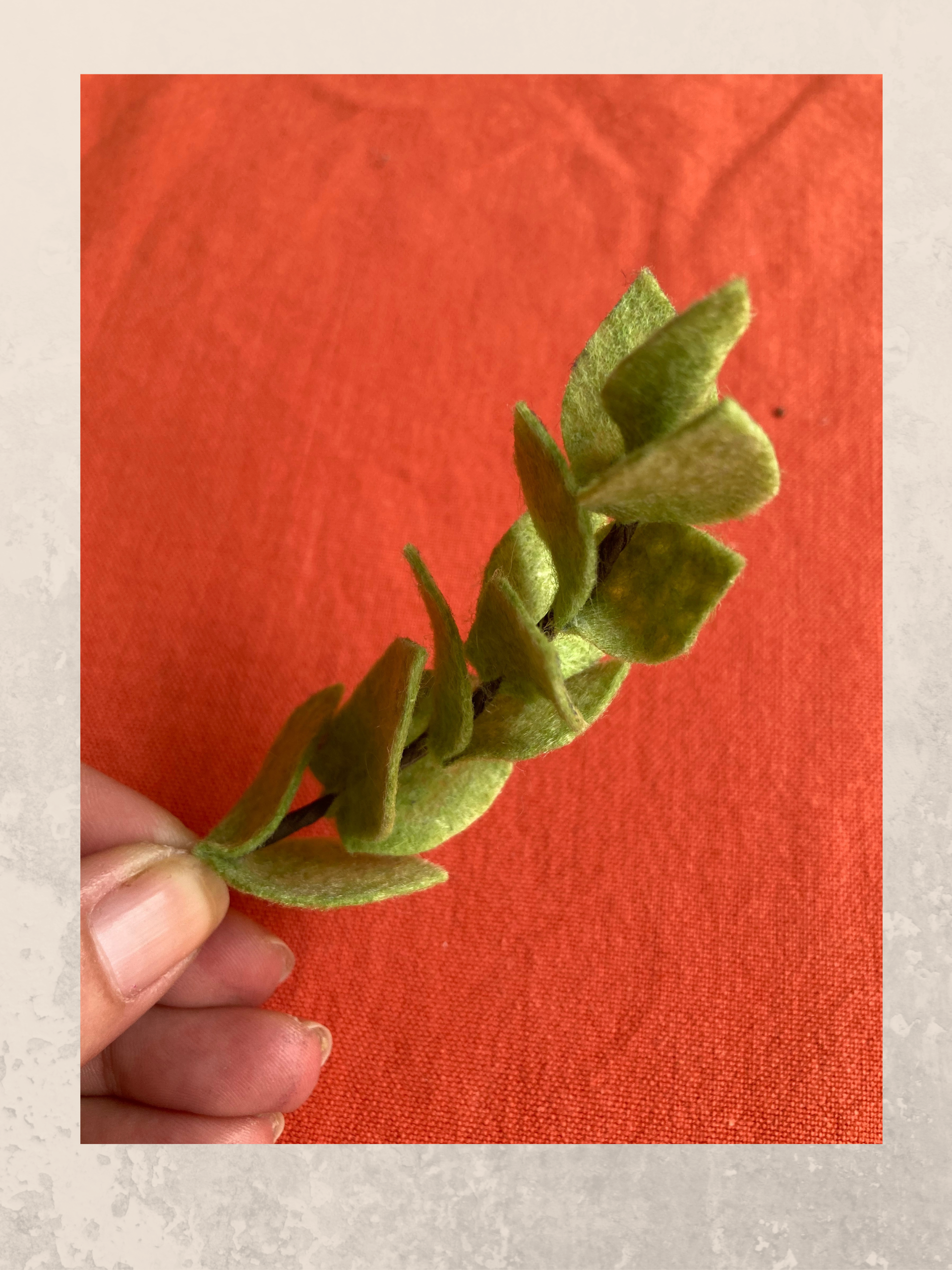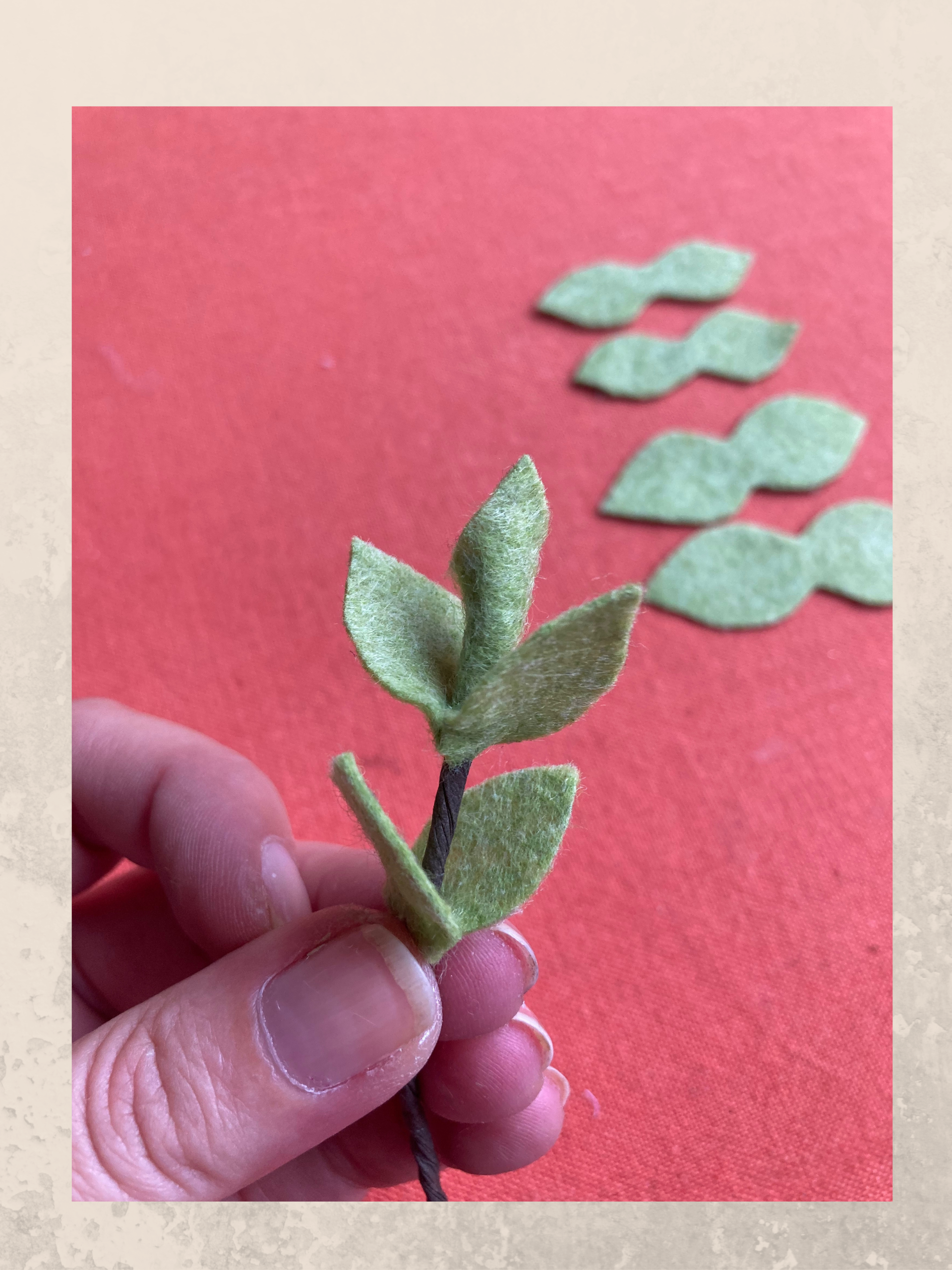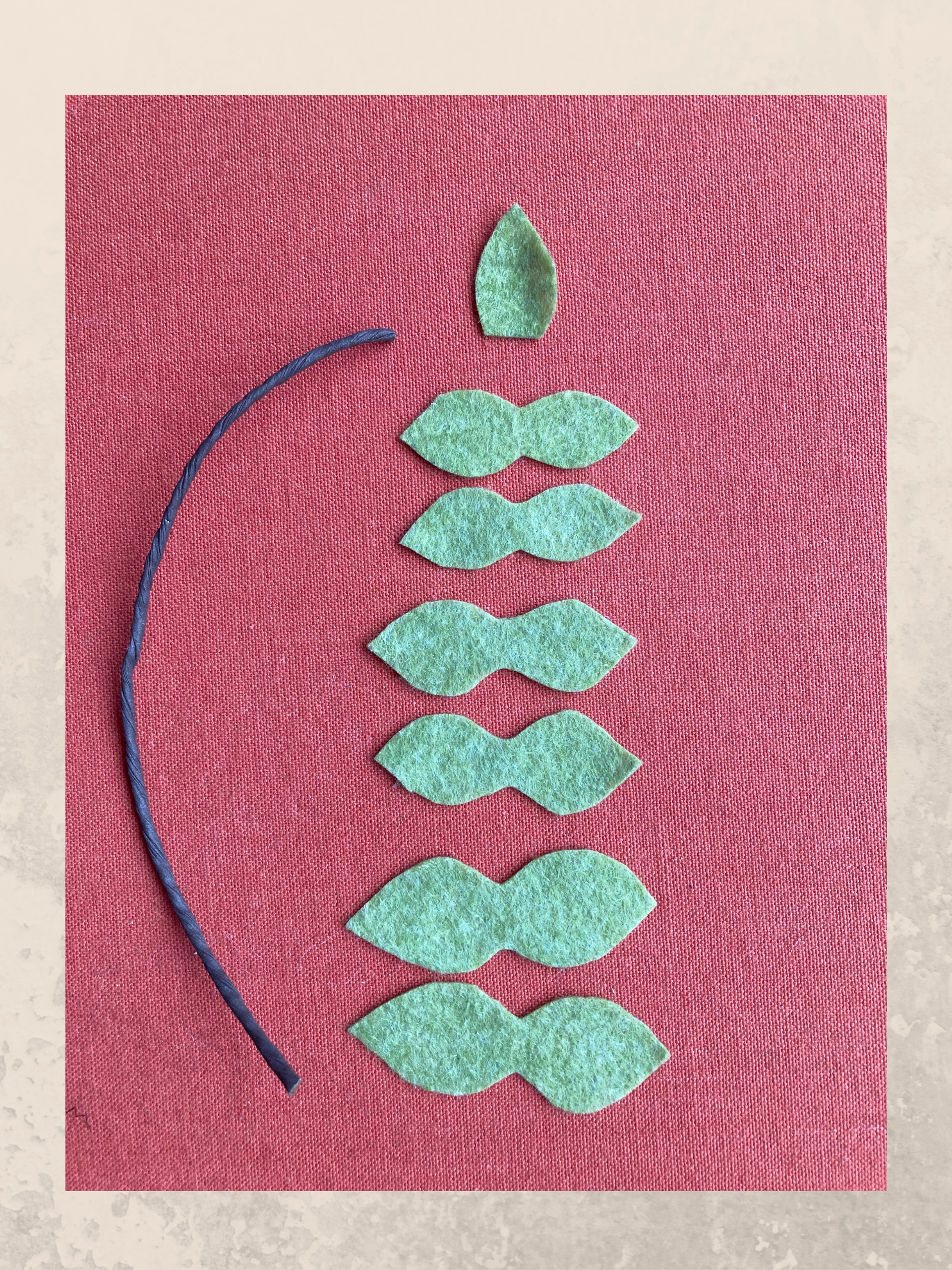 Il primo modello che ti propongo di realizzare è composto da cinque rametti. Per ogni rametto occorrono una foglia singola e tre coppie di foglie doppie. Disegna le foglie prima a mano libera in tre misure differenti dopo di che ritagliale dal pannolenci verde chiaro. Pratica un piccolo foro nella parte centrale di ciascuna foglia doppia. Taglia un pezzetto di filo di carta che fungerà da gambo e con la colla a caldo incolla ad una delle estremità la foglia singola. Prosegui incollando le due foglie doppie più piccole poi continua con quelle medie, infine incolla sul gambo anche quelle grandi. Per ottenere un effetto più naturale possibile, incolla le foglie in modo sfalsato lasciando un piccolo spazio tra di loro.