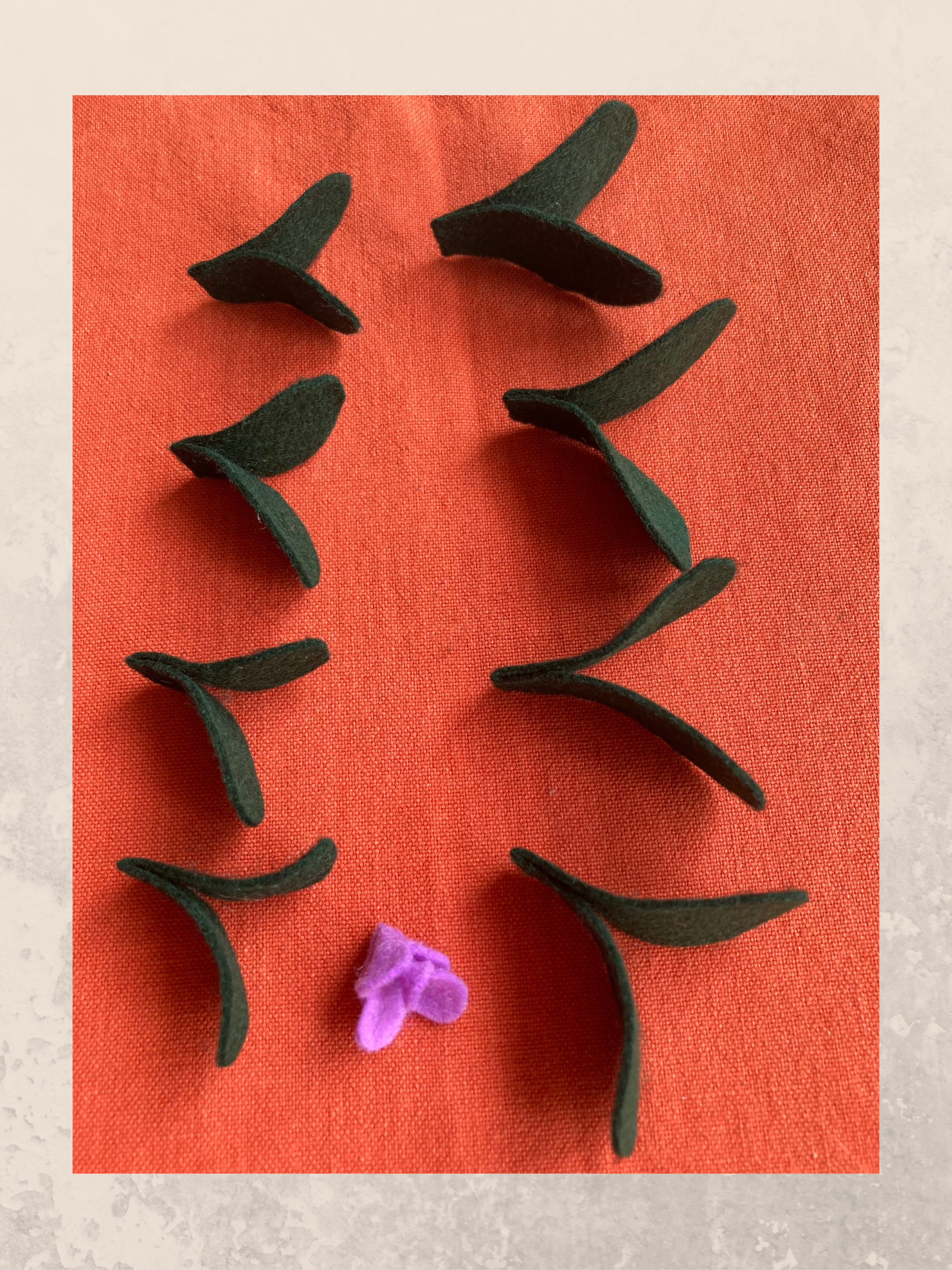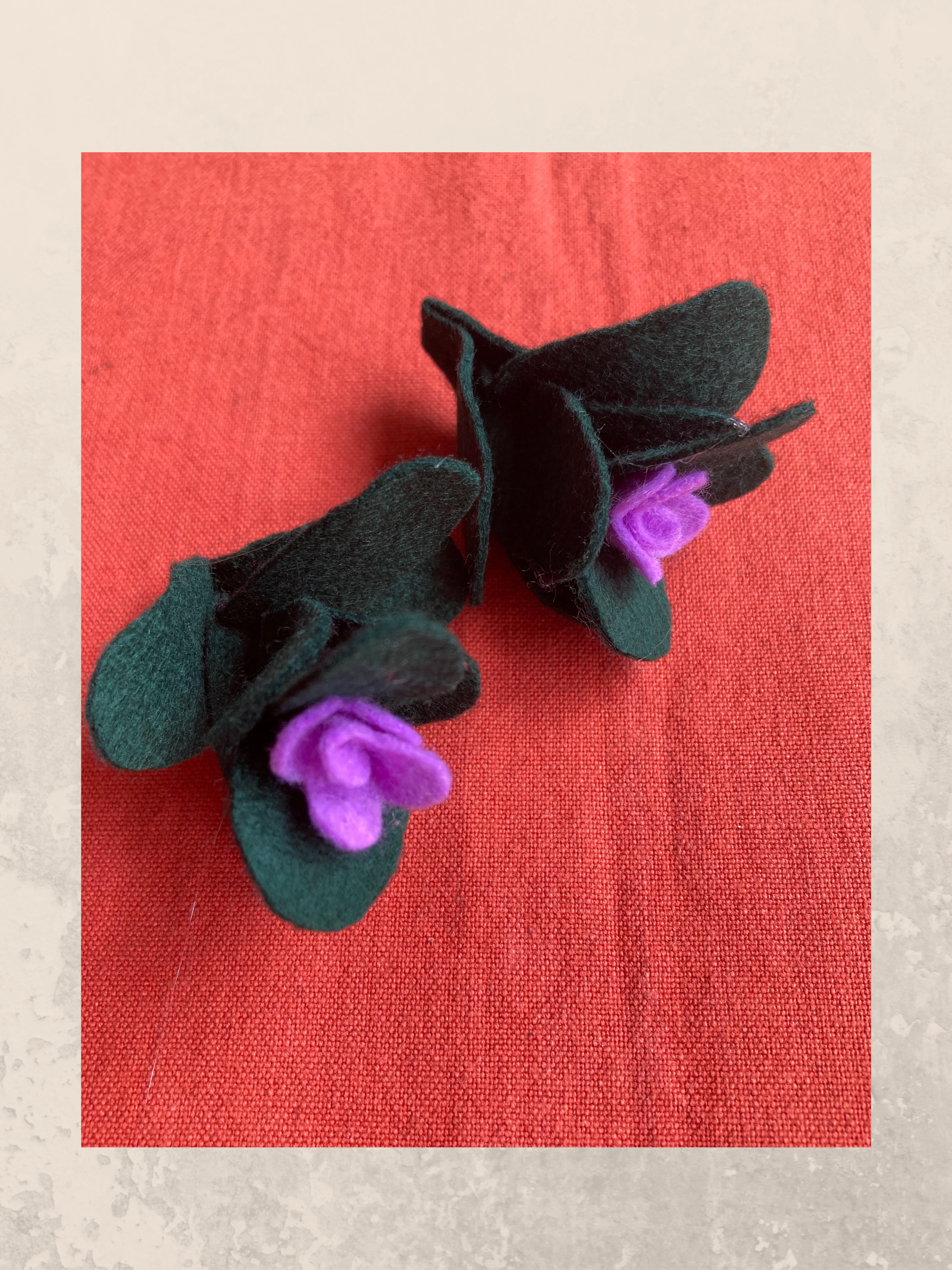 Il secondo modello è ancora più semplice da realizzare. Avrai bisogno di ritagliare dal pannolenci verde scuro una coppia di foglie piccole e una leggermente più grande come da immagine. Incolla la parte centrale con una goccia di colla a caldo e assembla il fiore incollando una sopra l’altra in maniera sfalsata prima le due foglie grandi poi quelle due più piccole. Per il fiore ritaglia una sagoma di sei petali dal pannolenci violetto, arrotola su se stesso ed incollalo all’ultima foglia.