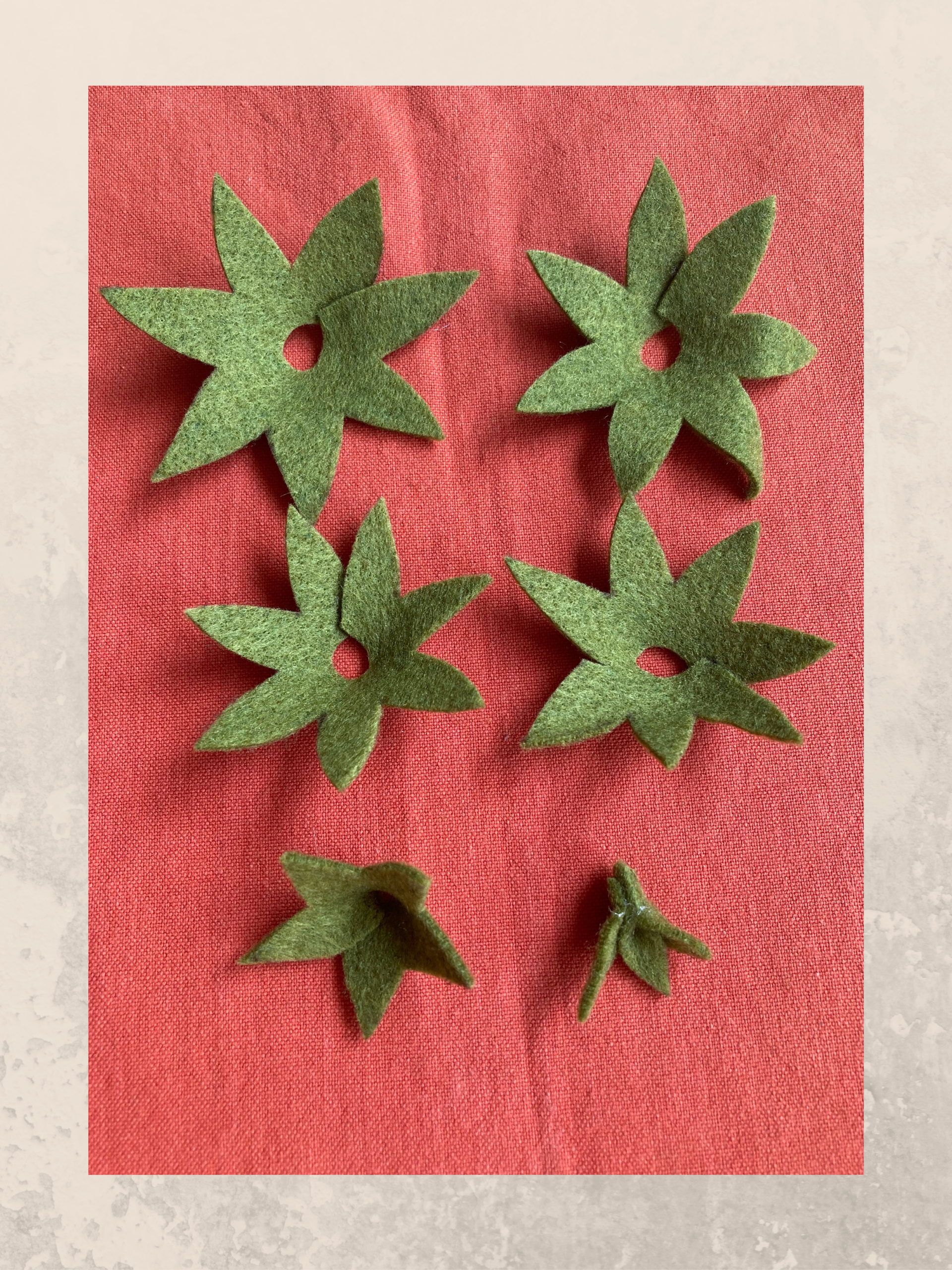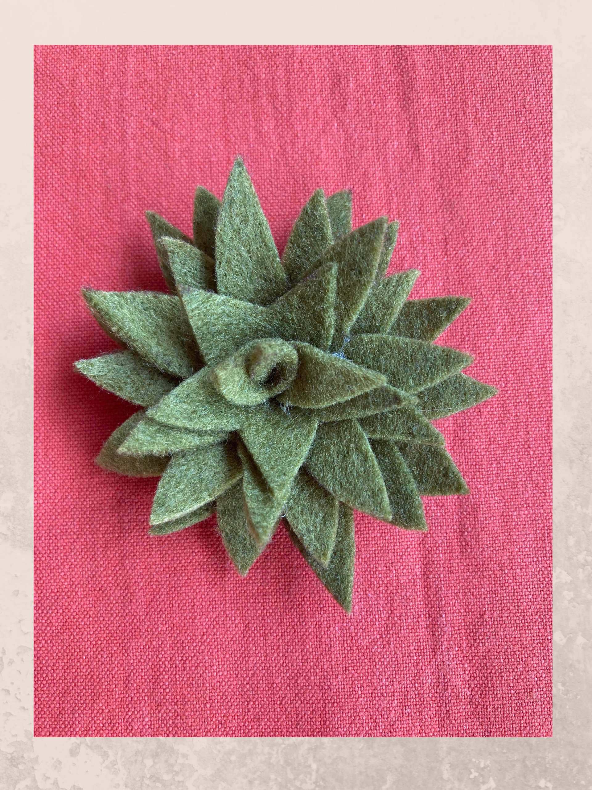 Per il terzo modello invece dovrai realizzare prima i cartamodelli a mano libera per poi ritagliarle dal pannolenci verde oliva. Come vedi dalle immagini, si tratta di sagome molto semplici e facili da disegnare, dovrai solamente tenere di conto della misura: ogni sagoma deve essere leggermente più grande di quella precedente aggiungendo magari qualche foglia in più. Una volta ritagliate dal pannolenci, le sagome vanno semplicemente incollate con una punta di colla, dopo di che sovrapposte partendo da quelle più grandi ed incollate uno sopra l’altra.