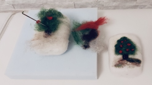 Lascia asciugare per due o tre giorni. Poi, passiamo alla parte divertente: le decorazioni! Ad esempio, per realizzare l’alberello di Natale: decora con ago da feltro punzecchiando a piccoli ciuffi lana di colore verde, per realizzare la chioma del pino, con piccolo ciuffo di lana marrone, creo sempre punzecchiando, il tronco e da ultimo, creo delle piccole palline con le mani cono la lana rossa e le vado a punzecchiare sulla chioma dell’albero. Aggiungo per fare un po’ ti terra, della lana marrone chiaro e a piacere aggiungo del filato lurez sempre punzecchiandolo. A questo punto, un po’ di polvere dorata per dar tocco al periodo di festa!