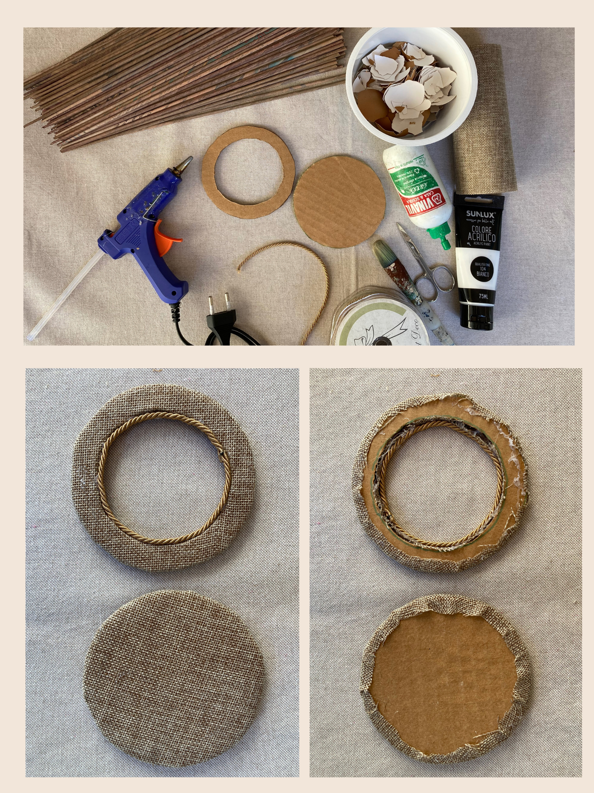 Dal cartone di recupero ritaglia 2 cerchi di 10 cm di diametro. Su uno di essi disegna un ulteriore cerchio di 7 cm di diametro e ritaglia tutti gli elementi con l’aiuto di un cutter. Rivesti entrambi i cerchi con il tessuto simil iuta come da immagine.