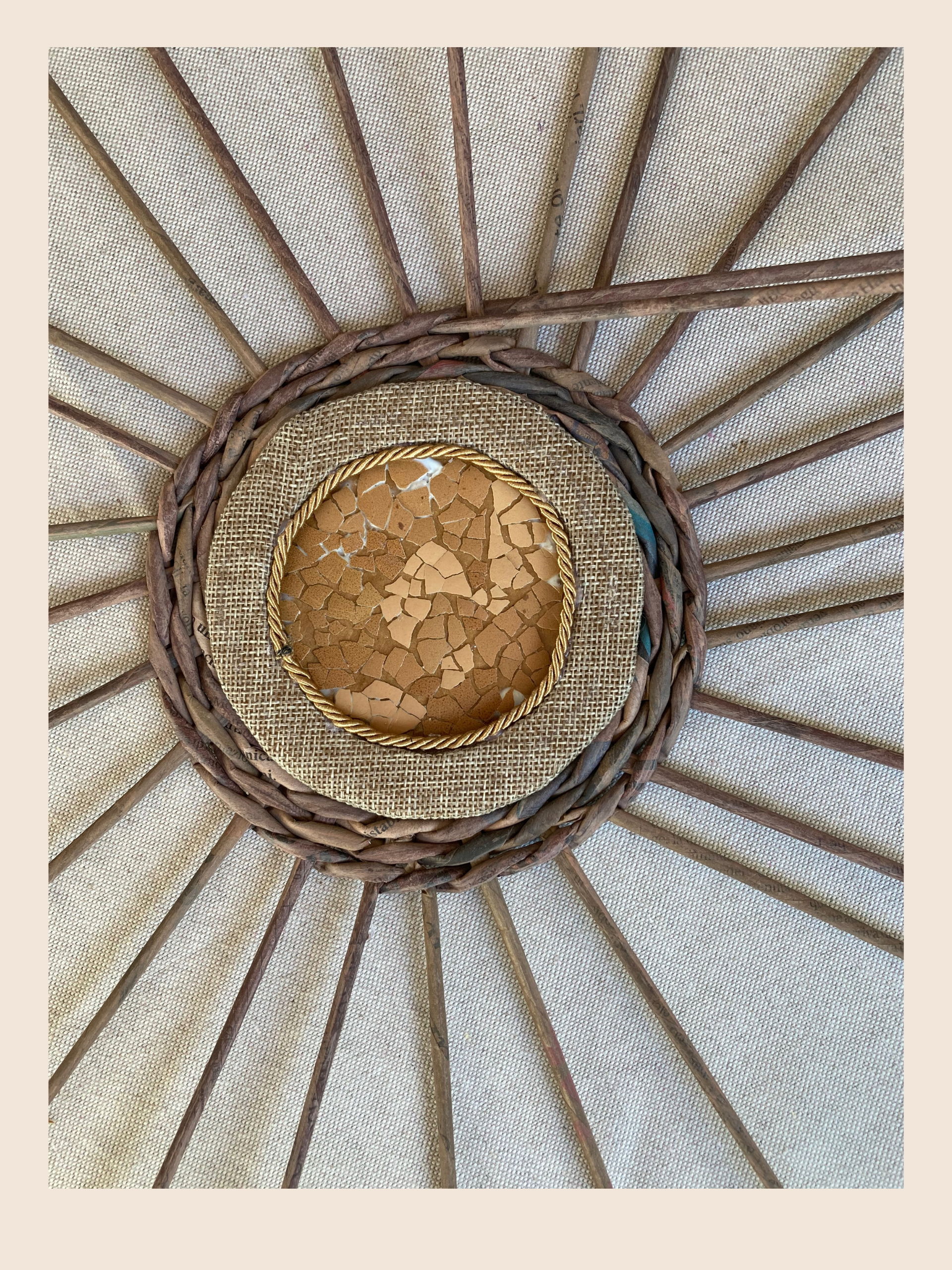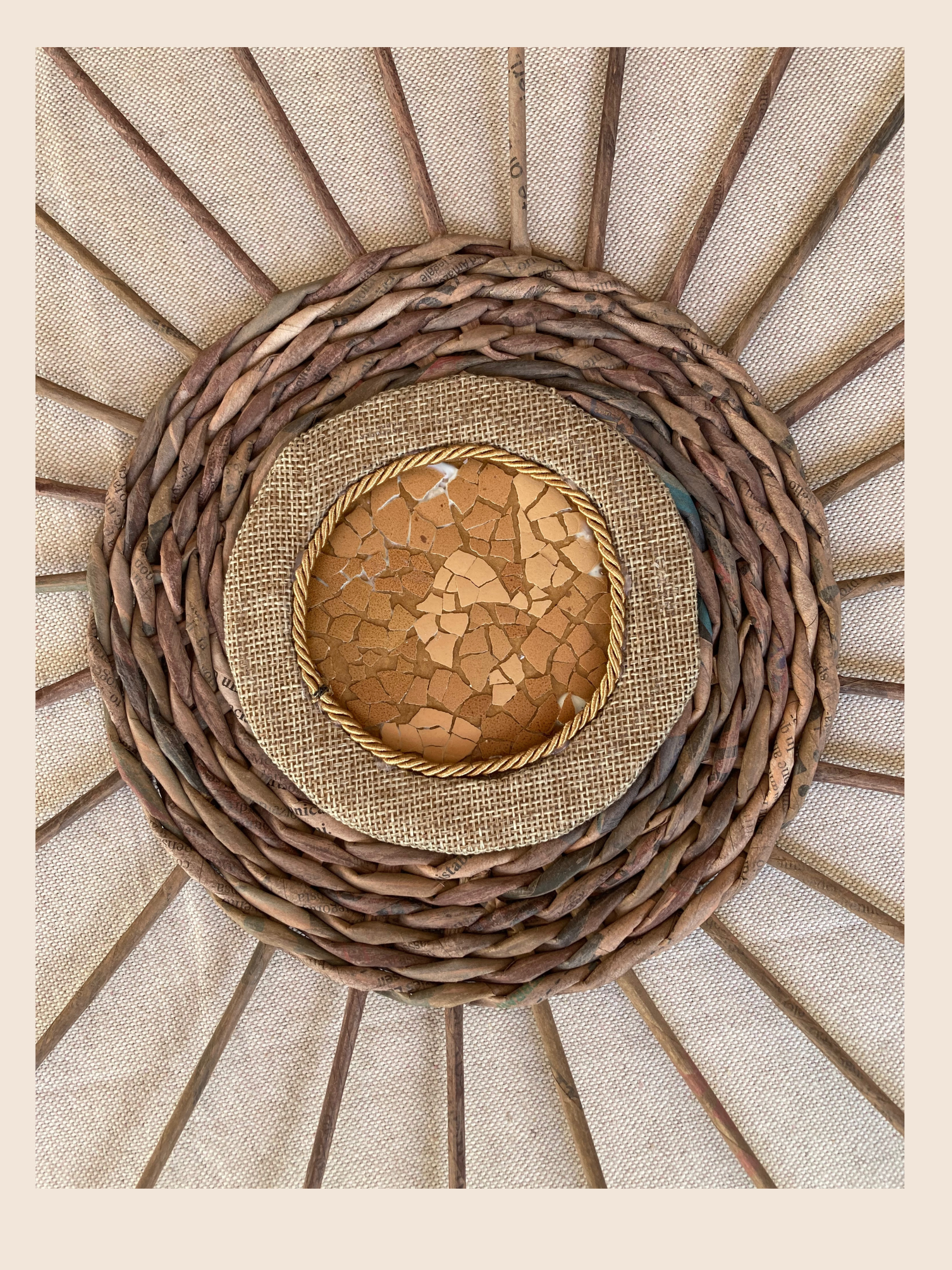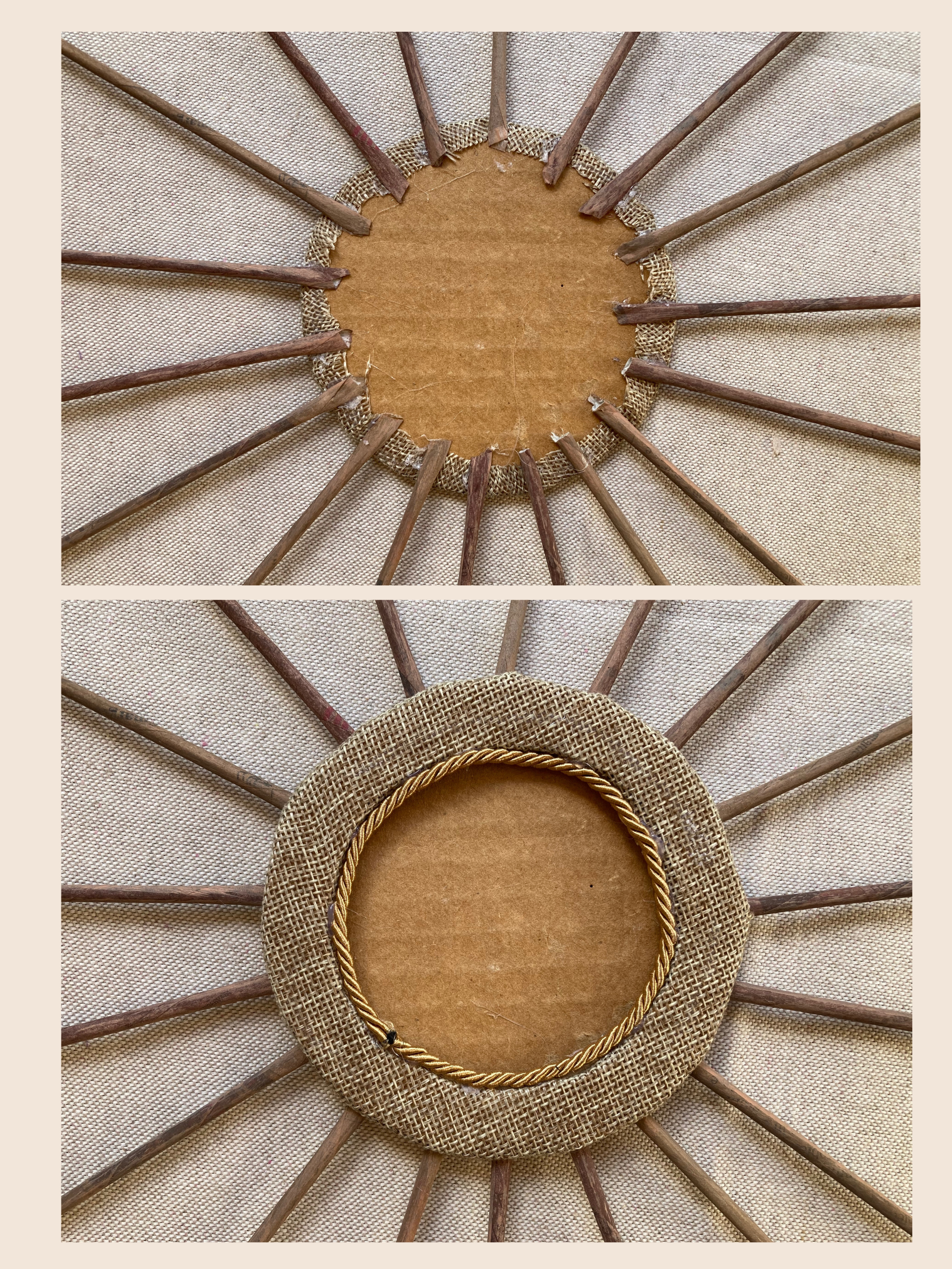Incolla 18 cannucce sulla parte non rivestita del cerchio intero e poi incolla sopra l’altro cerchio lasciando intravedere il cartone sottostante. Applica la passamaneria tutto attorno alla parte centrale.