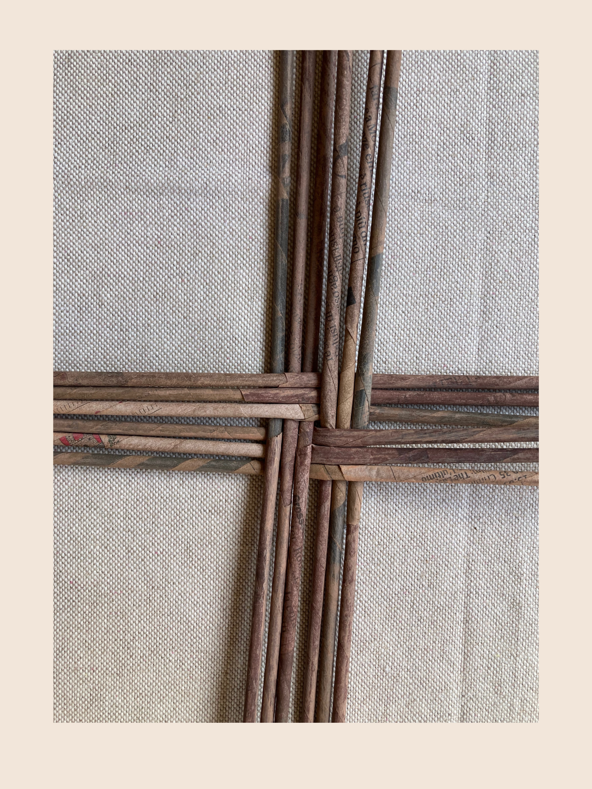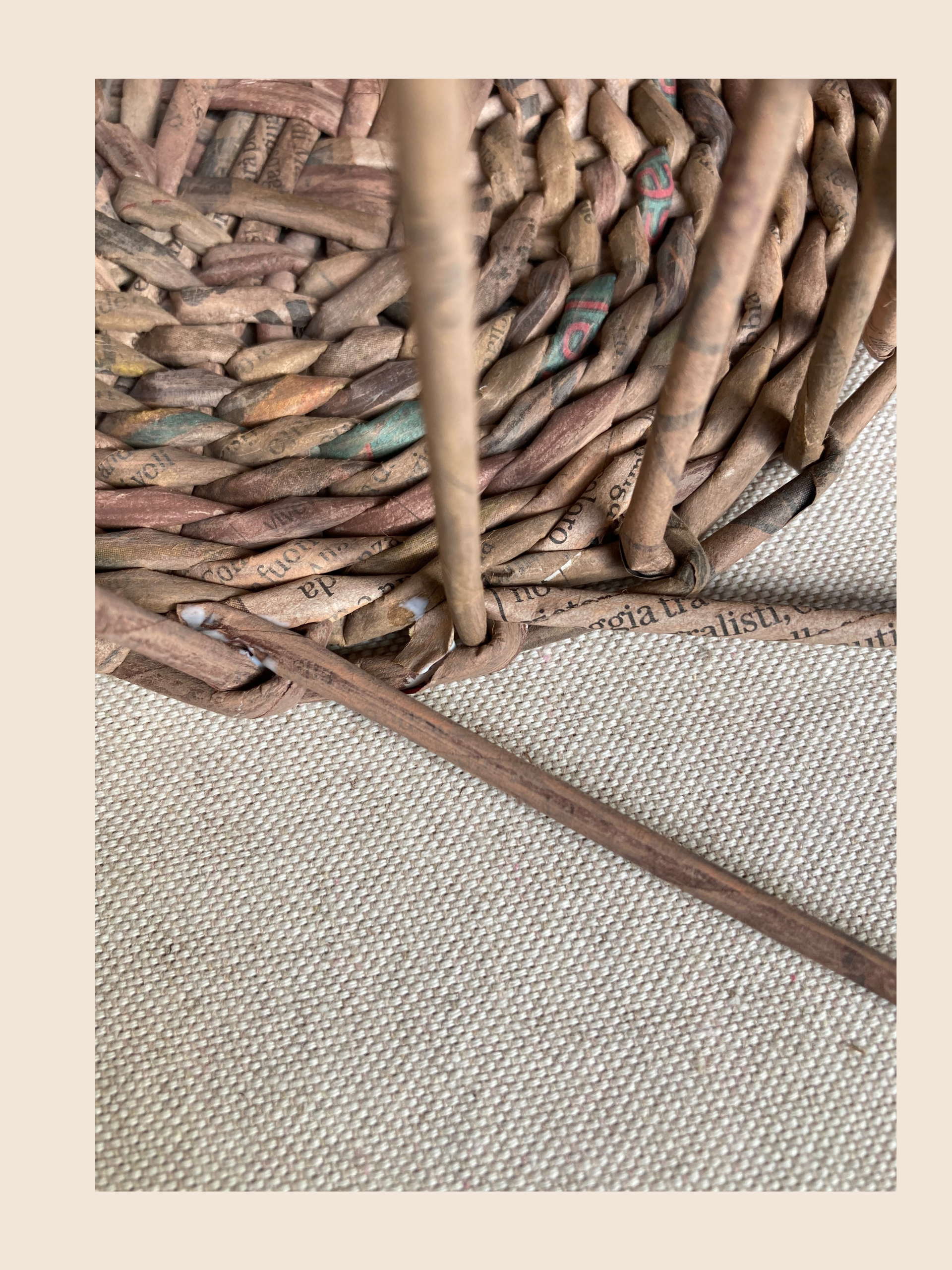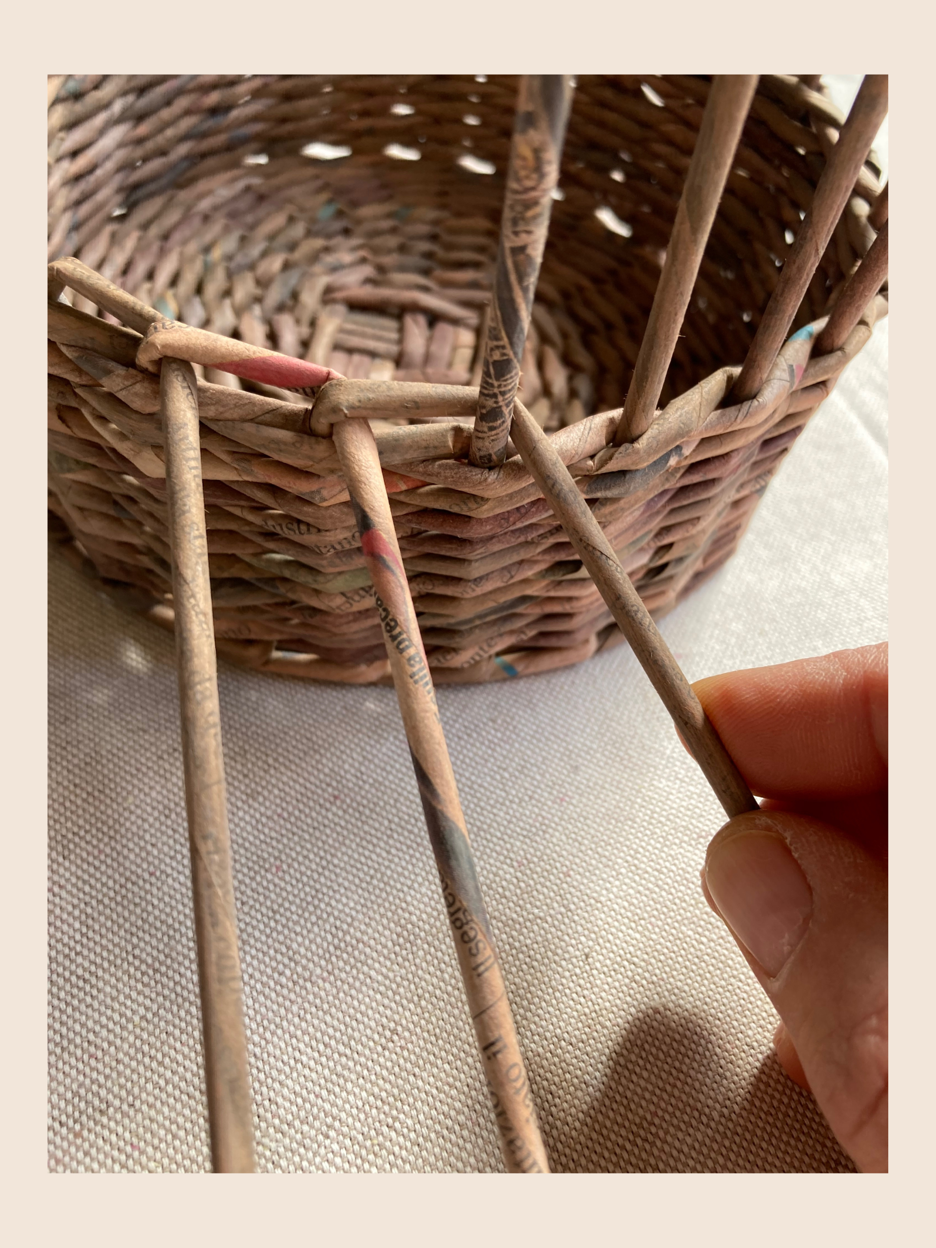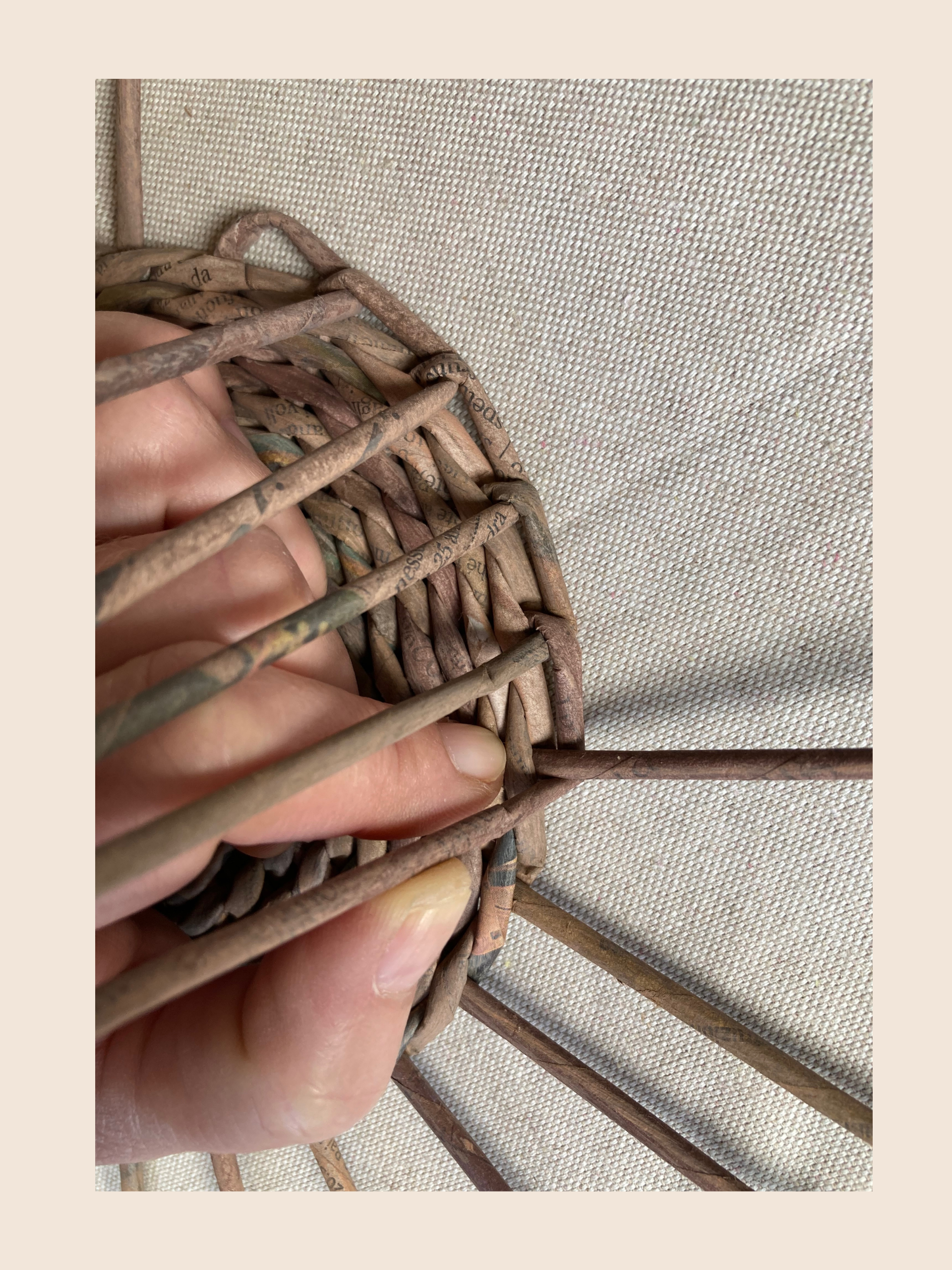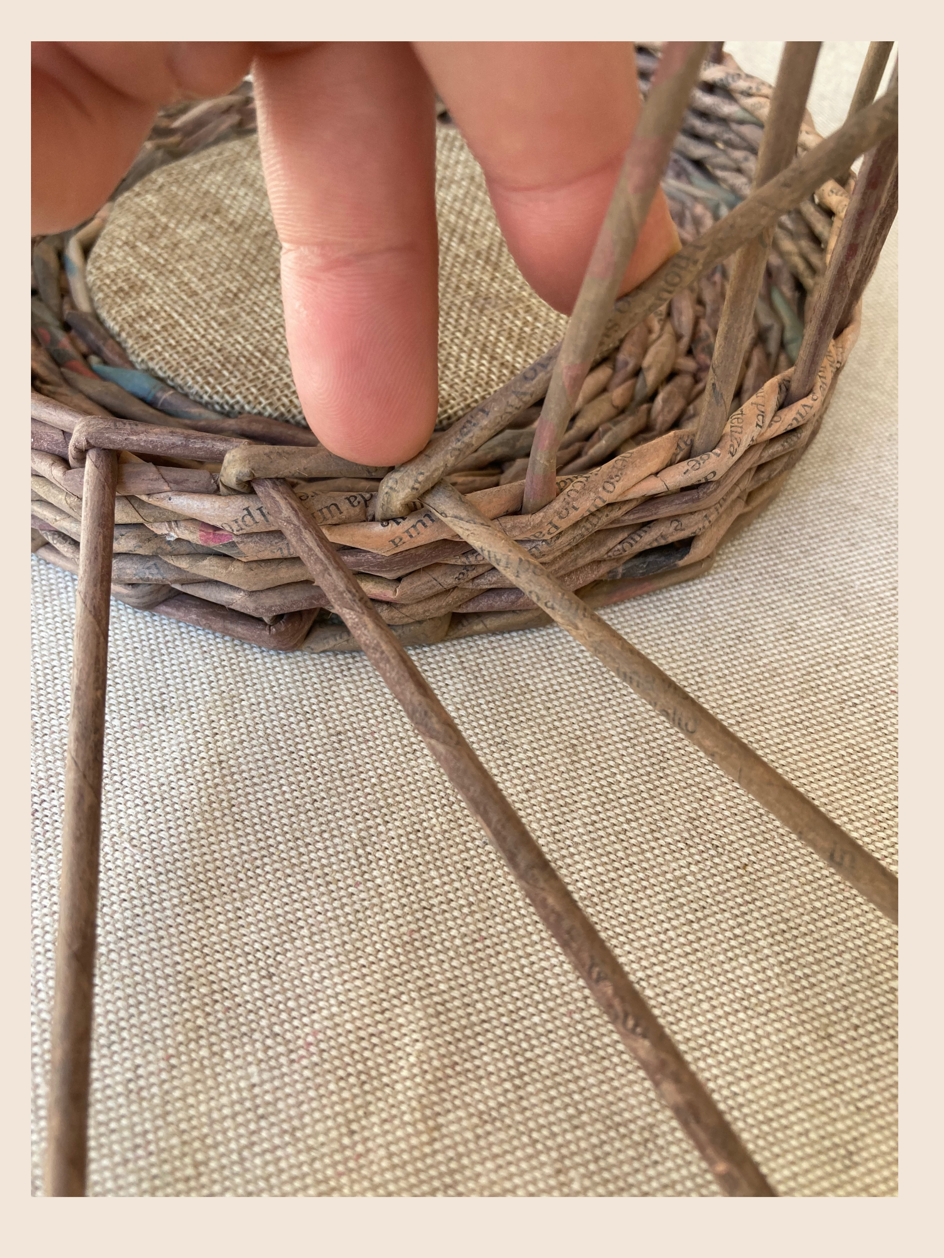 Raggiunti i 14 cm di diametro della base taglia ed incolla i tessitori ed alza i montanti per poter proseguire l’intreccio in verticale. Intreccia sempre a due tessitori quindi incolla due cannucce alla base di due montanti a scelta. In tutto realizza 10 giri di intreccio.