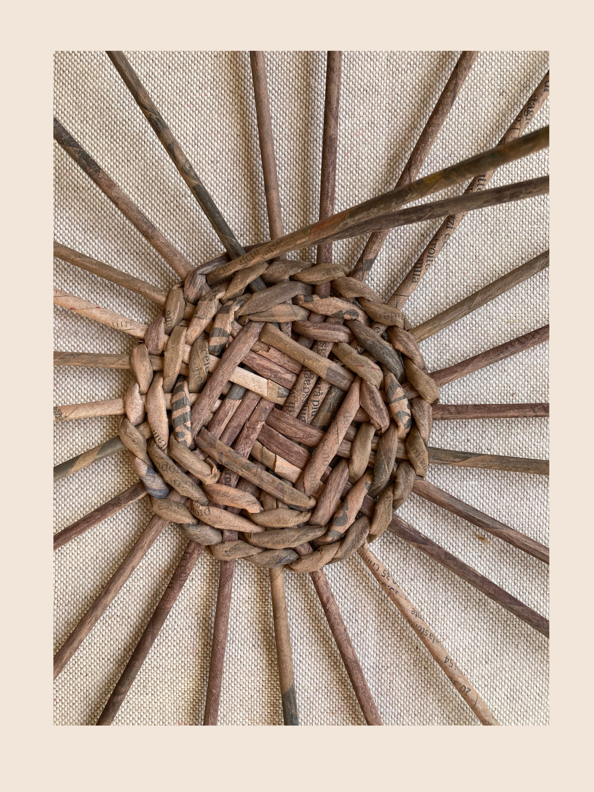Infila due cannucce l’una nell’altra e piegale a metà ottenendo così i tuoi due tessitori. Ricordati sempre di segnare il primo montante da cui inizi l’intreccio per evitare di non completare i giri di intreccio successivi. Realizza il primo giro di tessitura passando alternatamente al di sopra e al di sotto dei gruppi di sei montanti girando il raggio in senso orario. Al secondo giro comincia a suddividere tra di loro i montanti in gruppi da due e continua ad intrecciare abbracciando due montanti alla volta anche per i successivi due giri. Al quarto giro dividi ancora i montanti in modo da poter dare alla base sempre di più la forma rotonda. Prosegui ad intrecciare per altri 7 giri.