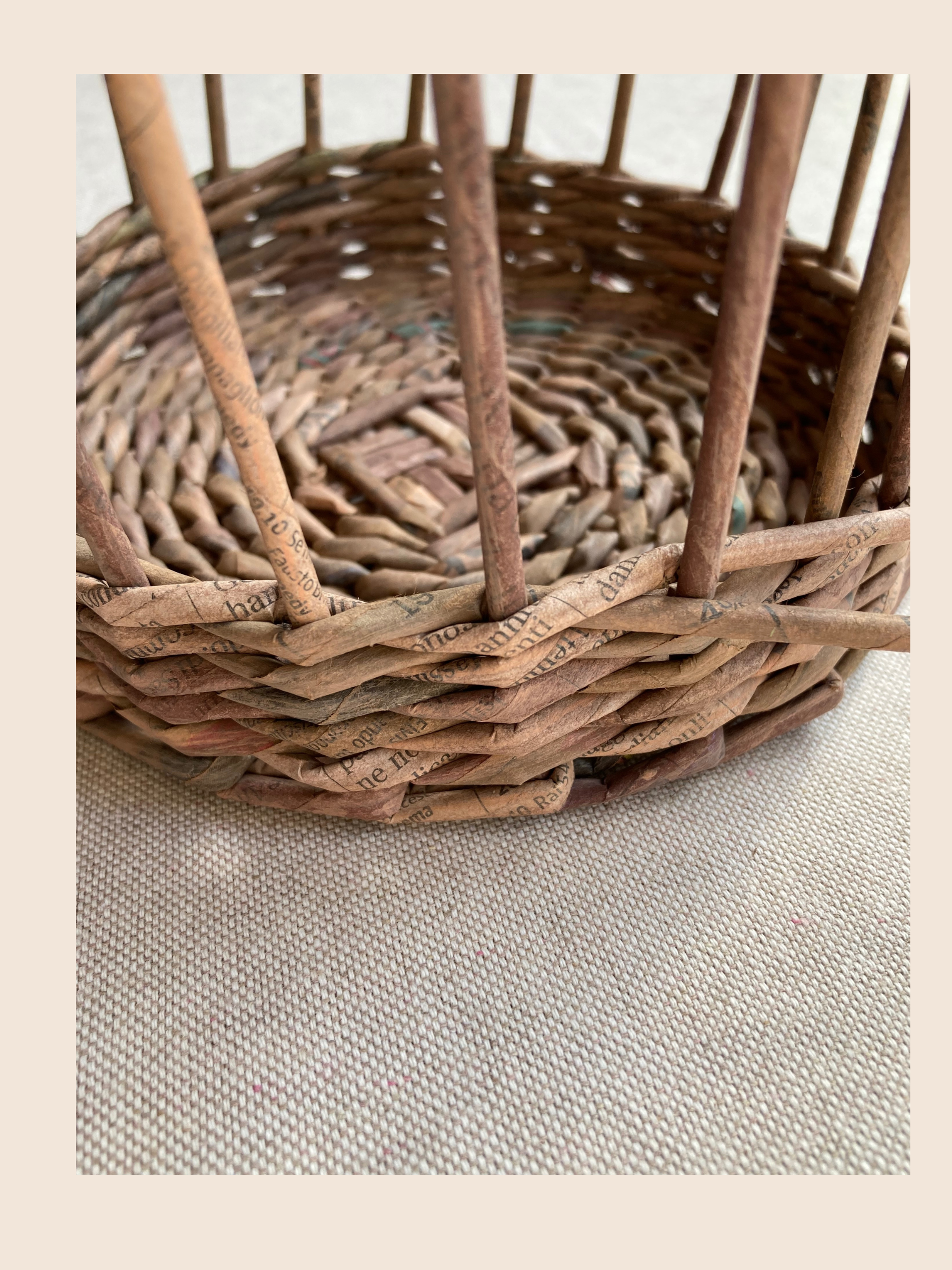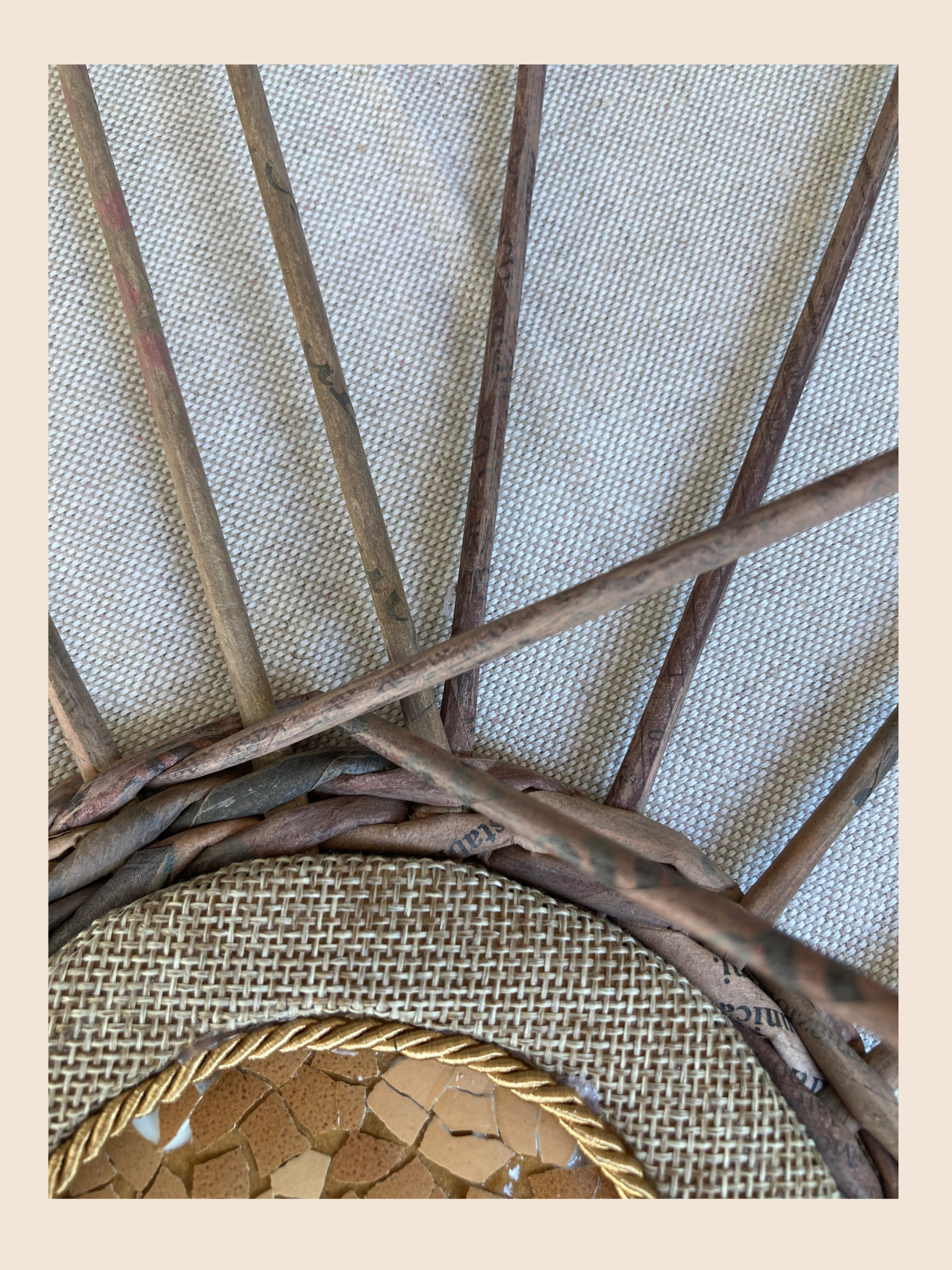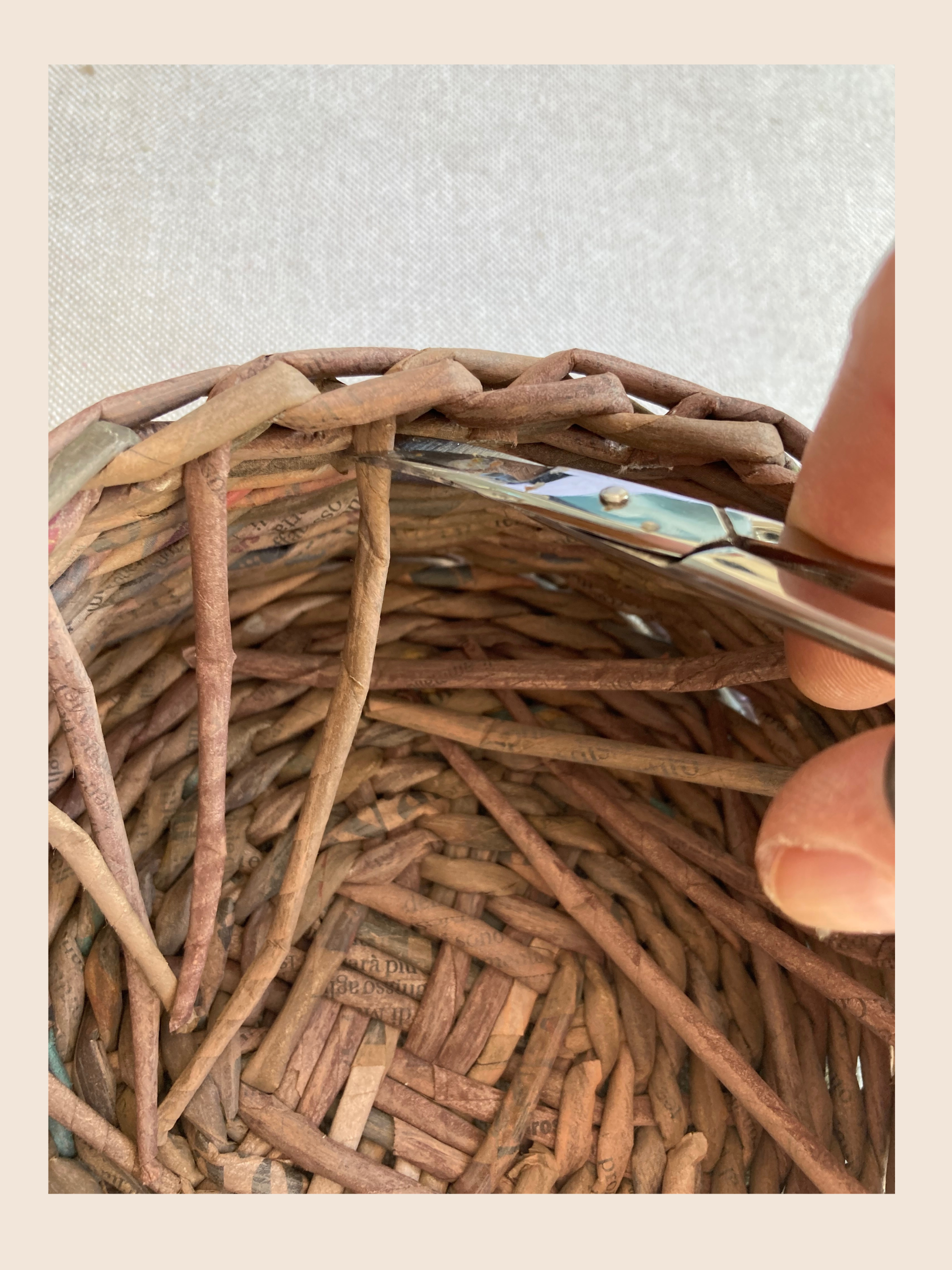 Taglia i tessitori in eccesso ed incollali alla base dell’intreccio. Realizza una chiusura semplice composta da due passaggi. Al primo abbassa ogni montante passando dietro al successivo e portandolo verso l’esterno. Al secondo passaggio passa sopra al montante successivo portando ogni montante già abbassato verso l’interno. Terminata la chiusura taglia a filo tutti i montanti.