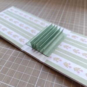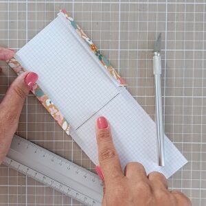 Ripieghiamo verso l’interno le linguette esterne e rivestiamo anche questo lato con un pezzetto dello stesso florence bianco al centro e due fogli di carta pattern lateralmente. Incolliamo infine la spina centrale. Per tutta questa operazione io ho utilizzato della semplice colla Nuvo stesa uniformemente su tutta la superficie della chipboard.