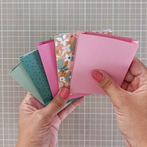 Ripeti l’operazione per altre 4 volte. Dovrai creare in tutto 5 bustine, io ne ho realizzate 2 con carte pattern e 3 con i fogli florence monocolore. IMPORTANTE: Le bustine create non vanno ancora chiuse!